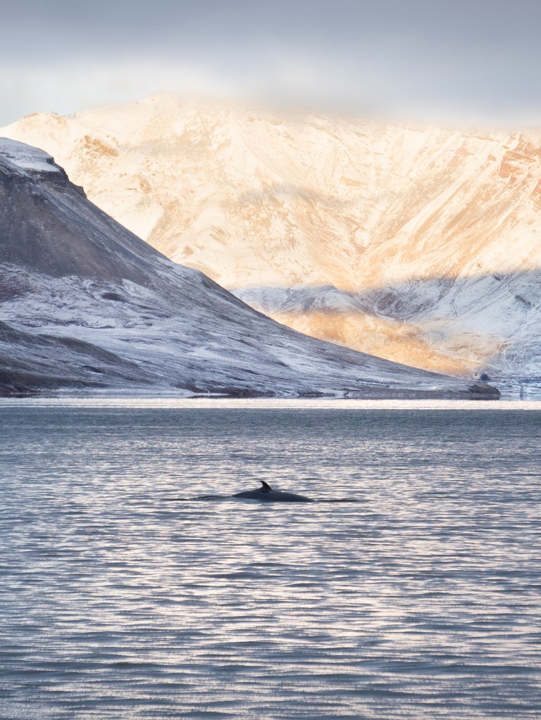 Ein Zwergwal im Billefjord – Diese majestätischen Tiere erreichen eine Länge von bis zu 10 Metern, wiegen bis zu 15 Tonnen und sind auf der gesamten Nordhalbkugel verbreitet.